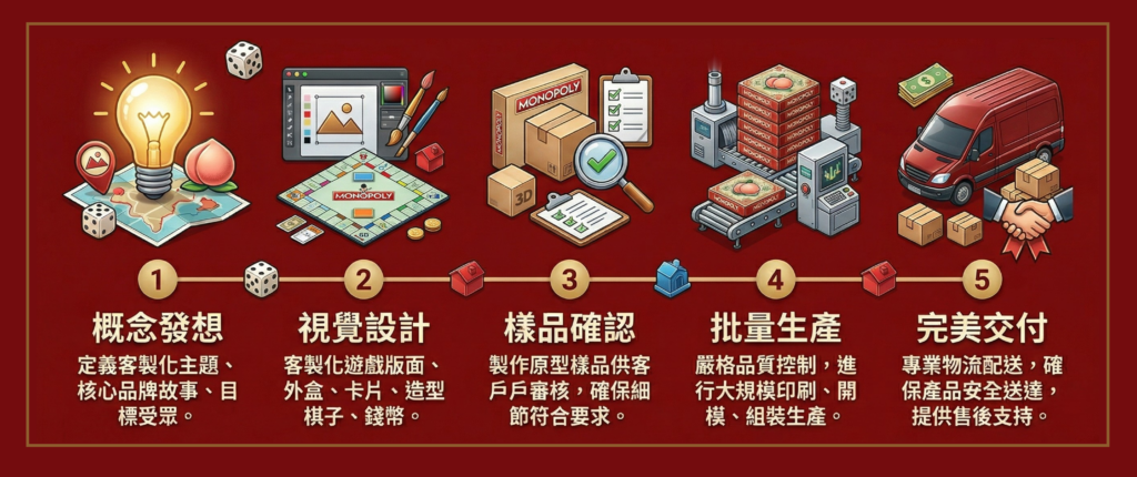 打造專屬桌遊比想像中更簡單!我們提供完善的五步驟一站式服務,帶領您依序完成概念發想、視覺設計、樣品確認、批量生產到完美交付